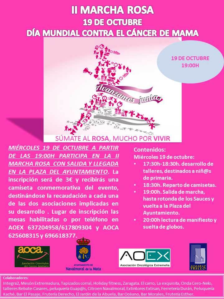 «Súmate al rosa, mucho por vivir» es el lema elegido para la II Marcha Rosa Contra el Cáncer de Mama, que se celebrará el miércoles 19. La cita, enmarcada dentro de la Semana de Sensibilización contra el Cáncer de Mama, servirá para unir, como ya lo hiciera el año pasado, a las dos asociaciones ligadas a esta enfermedad que operan en la población, la Asociación Oncológica Extremeña (AOEX) y la Asociación Oncológica del Campo Arañuelo (AOCA).