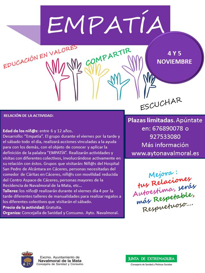 La concejalía de Sanidad y Consumo va a llevar a cabo el primer fin de semana de noviembre el proyecto Empatía, una de las iniciativas ... ganadoras de la Convocatoria de Proyectos de Educación para la Salud. Se trata de crear conciencia social dando a conocer el significado de ese término, ponerse en lugar del otro, a una veintena de escolares de 6 a 12 años.