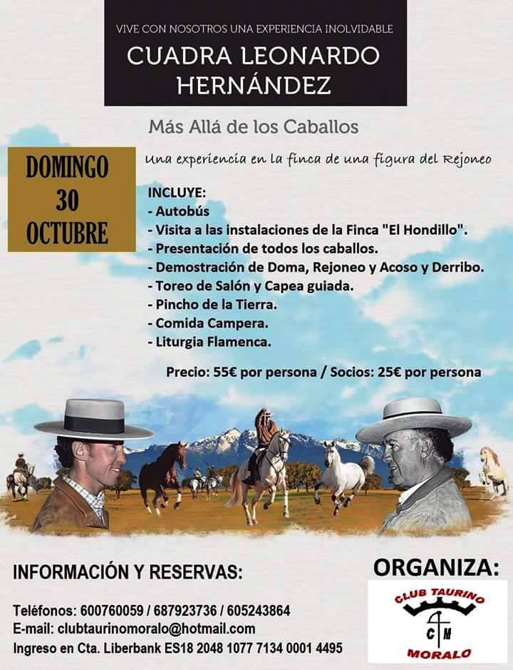 El Club Taurino Moralo mantiene abierto el plazo de inscripción para participar en la excursión que realizará el domingo a Casatejada para conocer y disfrutar ... la finca del rejoneador Leonardo Hernández, una de las máximas figuras del rejoneo actual.