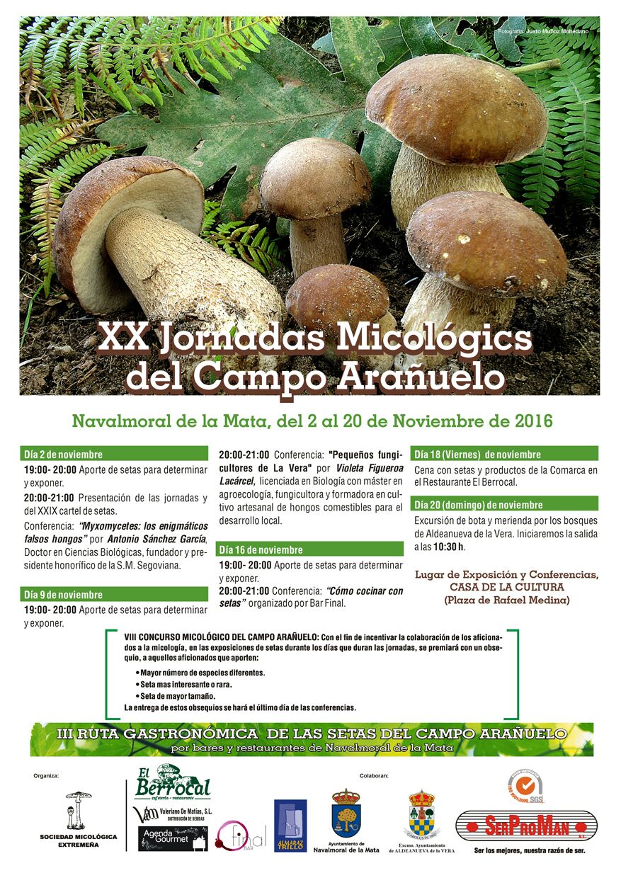 En la tarde del miércoles se inicia en la casa de cultura una nueva edición, y van 20, de las Jornadas Micológicas del Campo Arañuelo, destinadas a los aficionados a las setas de toda la zona. A partir de las siete ya se podrán llevar ejemplares para determinar y exponer. Una hora después se presentará el XXIX cartel de setas y comenzará la primera conferencia: 'Myxomycetes: los enigmáticos falsos hongos', a cargo de Antonio Sánchez, doctor en Ciencias Biológicas y fundador y presidente honorífico de la Sociedad Micológica Segoviana.