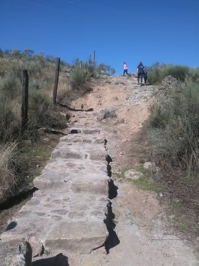 Después se detallan los trabajos que se vienen haciendo. Lo primero ha sido un desbroce selectivo de retamas y zarzas con desbrozadora manual. Después la realización de un pequeño vado en piedra irregular y colocación de pasaderas. En paralelo, en tramos de fuerte pendiente, de unos 300 metros, se construyen peldaños y pasos empedrados, mientras que los en tramos de fuerte pendiente y material arenoso se instalan peldaños de madera de un metro de anchura.