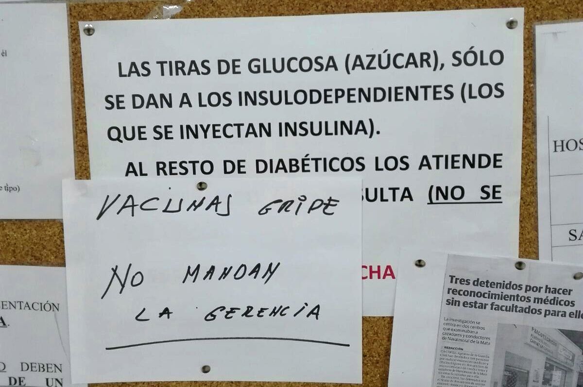 Un usuario del consultorio médico de Saucedilla, cansado de ir hasta tres veces sin poder vacunarse, ha colocado en el tablón de anuncios un ... cartel que advierte, entre la sorna y la indignación, que no hay vacunas contra la gripe porque "no mandan, con la firma de una supuesta gerencia.