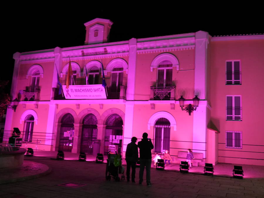 Esta es la imagen que ofrecía en la noche del jueves la fachada del Ayuntamiento, iluminada de rosa, para sumarse a la celebración del Día Internacional de la Eliminación de la Violencia a las Mujeres que se conmemora con distintas actividades, promovidas por el Consejo Sectorial de la Mujer y varios colectivos sociales. La transformación ha sido posible gracias a 8.000 watios de potencia repartidos en 16 focos.