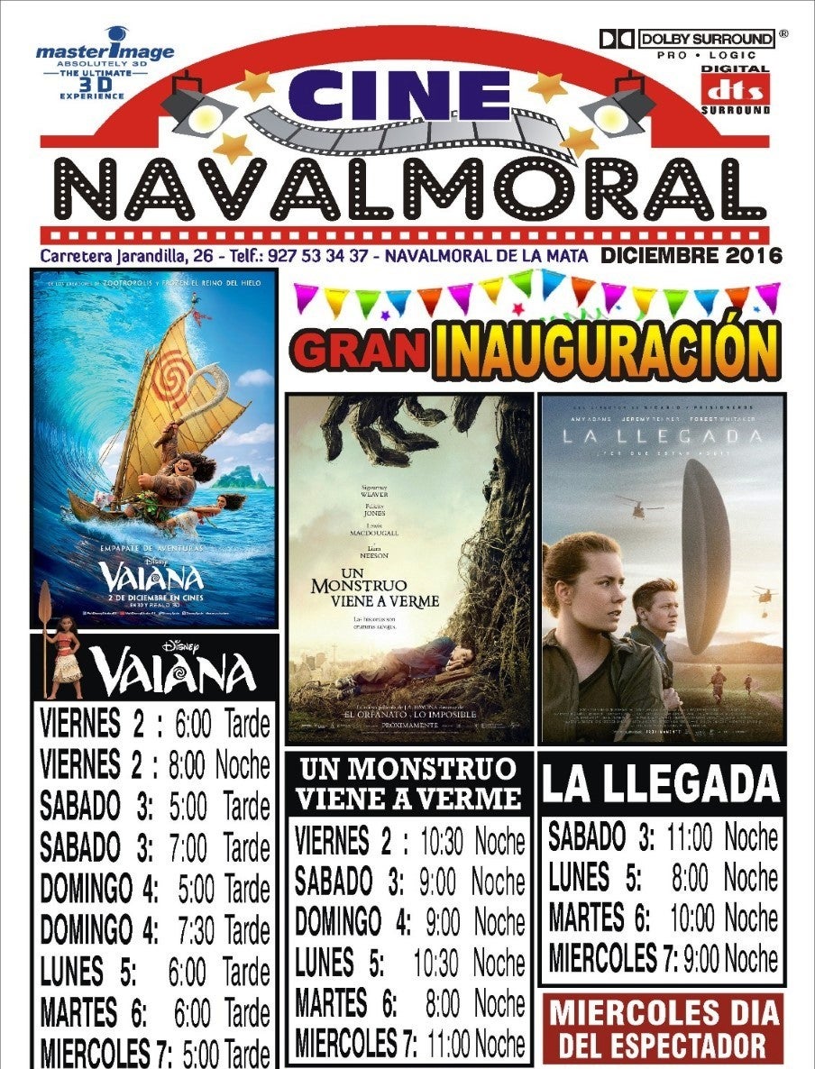 Ya está en la calle la primera programación de la nueva etapa que abrirá el cine comercial en Navalmoral a partir del viernes, casi nueve años después de cerrarse el Cruz Blanca. 'Vaiana', 'Un monstruo viene a verme' y 'La llegada' son los primeros títulos que proyectará Cine Navalmoral.