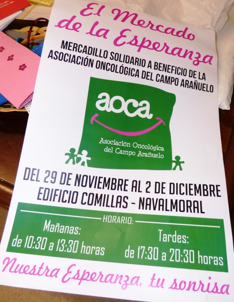 La Asociación Oncológica del Campo Arañuelo, AOCA, mantendrá abierto hasta el sábado el denominado Mercado de la Esperanza, un mercadillo solidario a beneficio de la lucha contra el cáncer. Está ubicado en la sala lateral de la Casa de Comillas, donde exponen y venden adornos, ropa y manualidades. Se puede visitar en horario de mañana y tarde.