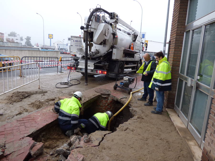 La avería es visible desde la propia carretera, puesto que se produjo en la acera que va al campo de fútbol, frente a la fuente de Moya, y en ella trabajan operarios de la empresa encargada del servicio, Urbaser, desde esa misma tarde. Sin embargo ha resultado mucho más complicado de lo que cabía esperar por su ubicación y en especial por los cables situados alrededor de la vieja tubería de fibrocemento que reventó.