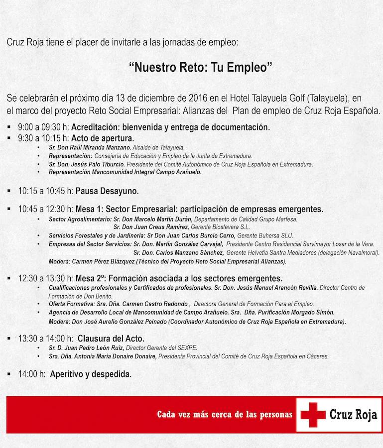 El Hotel Talayuela Golf, será el escenario el martes de las jornadas de empleo promovidas por Cruz Roja Española. Bajo el título Nuestro reto: tu ... futuro. Análisis e intervenciones estas jornadas constituyen un foro para el análisis, el debate y la reflexión acerca de las perspectivas de futuro de los mercados laborales entre diferentes entidades sociales, administraciones y agentes sociales.