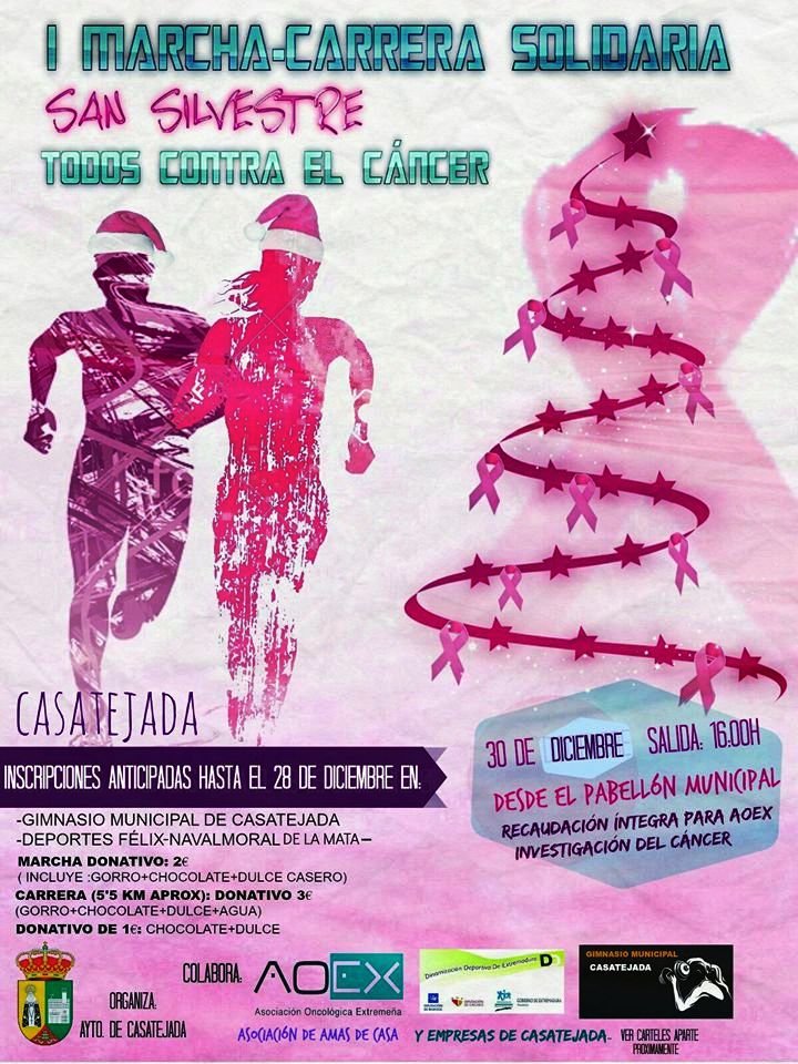 El miércoles se cierra el plazo de inscripción para participar en la I Carrera Solidaria de San Silvestre que se celebrará el viernes en Casatejada a beneficio de la Asociación Oncológica Extremeña (AOEX). De ahí su lema: Todos contra el cáncer.