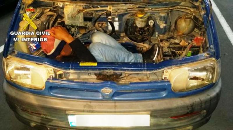 Los agentes sospecharon de la actitud nerviosa de los dos ocupantes de una furgoneta Nissan Vanette y decidieron inspeccionar su interior, descubriendo a una persona agazapada entre los elementos que conforman el motor del vehículo, que habían sido manipulados previamente para dotar de más espacio físico al inmigrante.