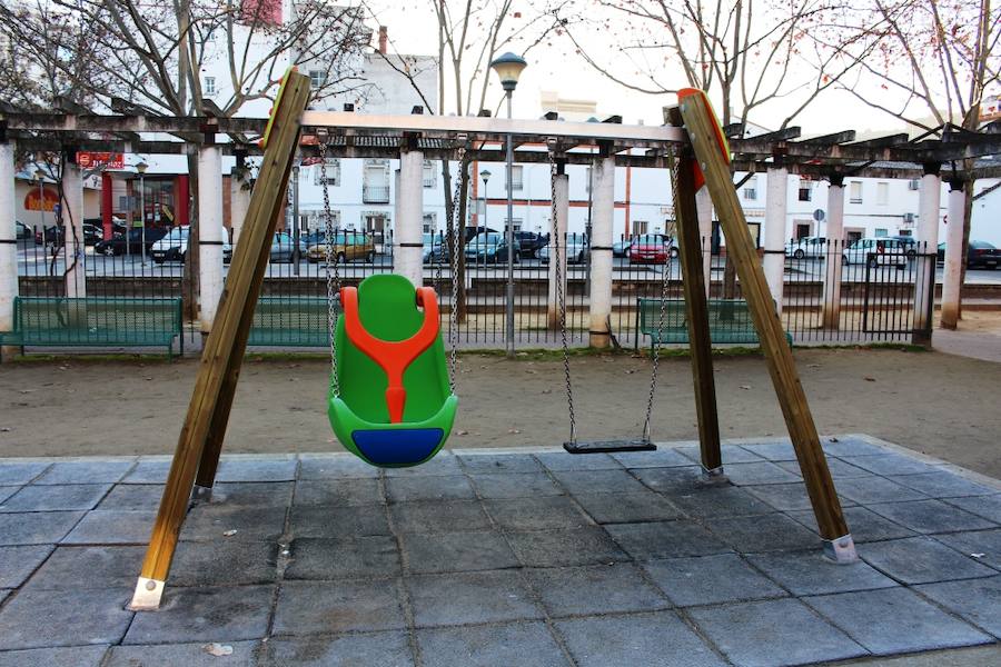 El columpio veleta, que es su nombre técnico, está reforzado con arneses abatibles para la seguridad de los usuarios. En total, se han instalado cinco balancines con esas características entre el parque de las Minas, los jardines colindantes al instituto Albalat, la plaza de la Serradilla, el jardín de la Bamba y el parque situado junto a las viviendas de Pozo Rancón.