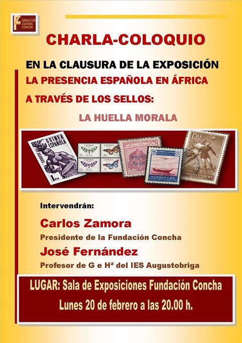 La Fundación Concha clausurará el lunes la exposición filatélica que tiene abierta en la última semana sobre ‘La presencia española en África a través de los sellos’, con la charla-coloquio que ofrecerán Carlos Zamora, presidente del patronato, y José Fernández, profesor de Geografía e Historia del instituto Augustóbriga. Será a partir de las ocho.