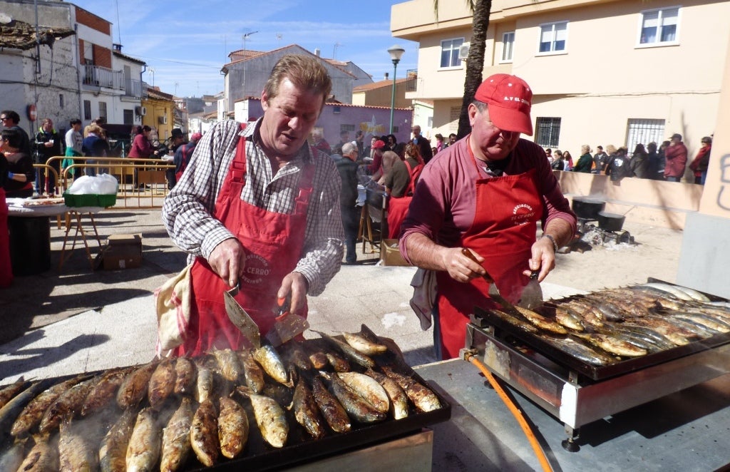 Quizá sea en la plaza de la Maceta del Cerro donde el número de comensales es mayor al ser el primer sitio donde empiezan a repartirse platos con sardinas, chorizo y panceta, que se preparan desde la madrugada hasta completar unas 1.500 raciones, que es la cifra que más o menos se repite todos los años. De hecho se quedaron sin sardinas, que los más rezagados pudieron recuperar en la siguiente parada del entierro, en la Marcha Verde, pasadas las dos de la tarde.