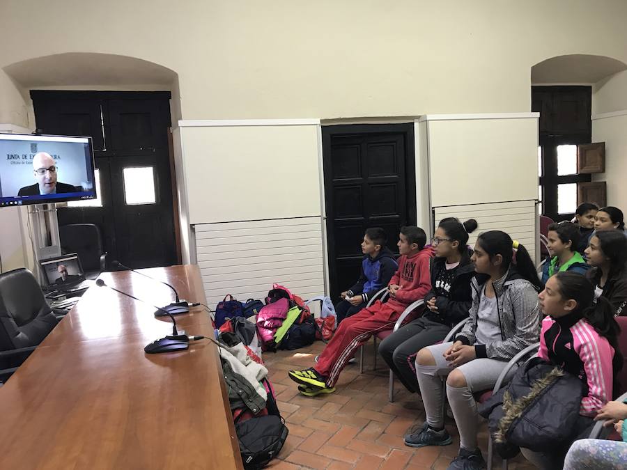 A continuación, los escolares han participado en una videoconferencia con el director de la Oficina de Extremadura en Bruselas, César Morcillo,sobre la importancia de formar parte de la UE, el trabajo que desarrollan las instituciones europeas y cómo las decisiones que se toman en Europa afecta a la vida cotidiana de los ciudadanos.