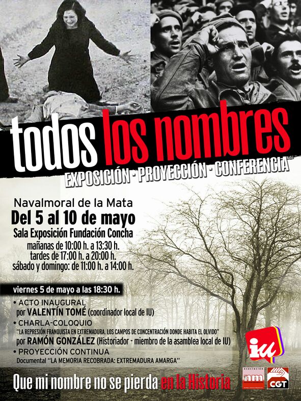 'Todos los nombres'. Así ha llamado IU a la actividad que va a realizar en los próximos días en Navalmoral alrededor de la Guerra ... Civil, la represión franquista y la Memoria Histórica, que incluye una exposición, una conferencia y la proyección de un documental.