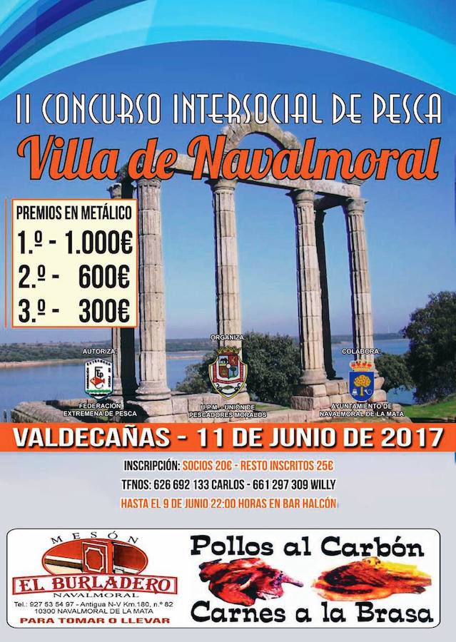 1.000 euros el primer clasificado, 600 el segundo y 300 el tercero son los principales premios del II Concurso Intersocial de Pesca 'Villa de Navalmoral', que se celebrará el domingo en el pantano de Valdecañas organizado por la Unión de Pescadores Moralos. Pero también habrá paniers, cañas enchufables, televisores Led, jamones, bicicletas de montaña, boloñesas o cañas coup.