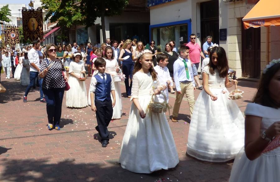 Un año más se ha cumplido la tradición de la procesión del Corpus Christi, que protagonizan los niños y niñas que han tomado la Primera Comunión. En la misma han estado más presentes que nunca abanicos y botellas de agua en manos de padres y madres para atender a los chavales ante el intenso calor de la jornada en su recorrido entre las iglesias de las Angustias y San Andrés.