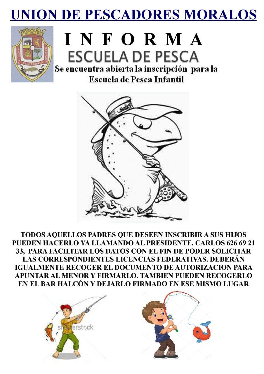 La Unión de Pescadores Moralos ha abierto el plazo de inscripción para los niños y niñas de Navalmoral y la zona que deseen participar en ... una nueva edición de la Escuela de Pesca, "que cada año recibe a los más jóvenes para ayudarlos en el aprendizaje y la práctica de la pesca", se dice en la convocatoria.