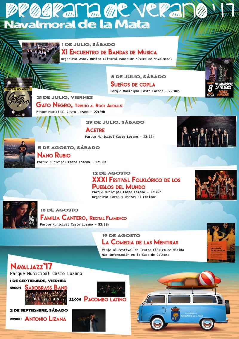La última cita del programa estival del 2017 será el festival Navaljazz, los días 1 y 2 de septiembre. El viernes 1 actuarán la Saxo Brass Band y Pacombo Latino. El sábado 2 lo hará el saxofonista, cantaor y compositor Antonio Lizana, un joven talento del nuevo flamenco-jazz que ha colaborado ya con primeras figuras como Miguel Ríos, Raimundo Amador o José Mercé.