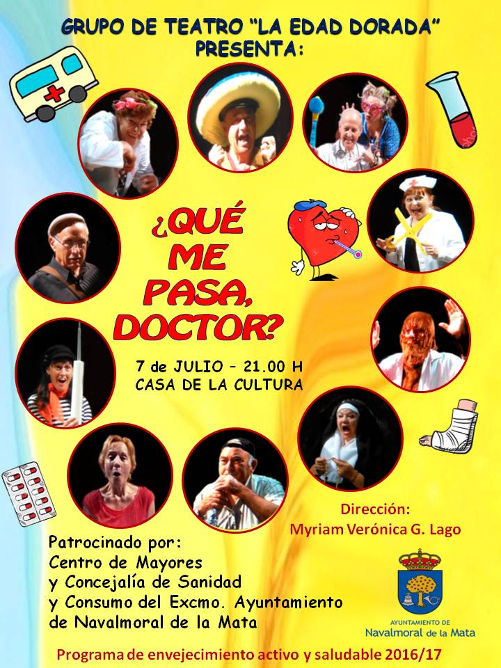 La casa de cultura acogerá el viernes la representación de la obra '¿Qué me pasa, doctor?', una comedia protagonizada por el grupo de teatro La Edad Dorada y dirigida por Myriam Verónica G. Lago. Su estreno pondrá fin a las actividades del taller de teatro y expresión corporal para mayores que se ha realizado en los últimos meses dentro del Programa de Envejecimiento Activo y Saludable. Empezará a las 21.00 h.