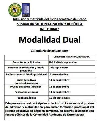 El instituto Zurbarán ha anunciado la apertura de un plazo extraordinario de matrícula para el ciclo formativo del Grado Superior de Automatización y Robótica Industrial, que imparte conjuntamente con la central nuclear de Almaraz, con un alto grado de inserción laboral. En el plazo ordinario se presentaron una veintena de solicitudes. El extraordinario se abrirá de 1 al 6 de septiembre.