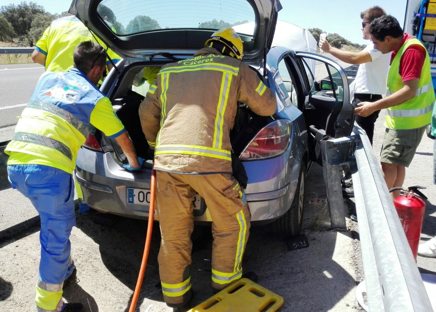 Una conductora de 36 años, natural de Cilleros, resultó herida, policontusionada, al quedar atrapada en el interior de su vehículo en un accidente de tráfico que se produjo a primera hora de la tarde del miércoles en la autovía EX-A1, de Navalmoral de la Mata a Plasencia, en el kilómetro 13,850. Intervinieron seis bomberos, cuatro guardias civiles, sanitarios UME y personal de mantenimiento de Carreteras. El vehículo quedó en la mediana, en dirección a Plasencia.