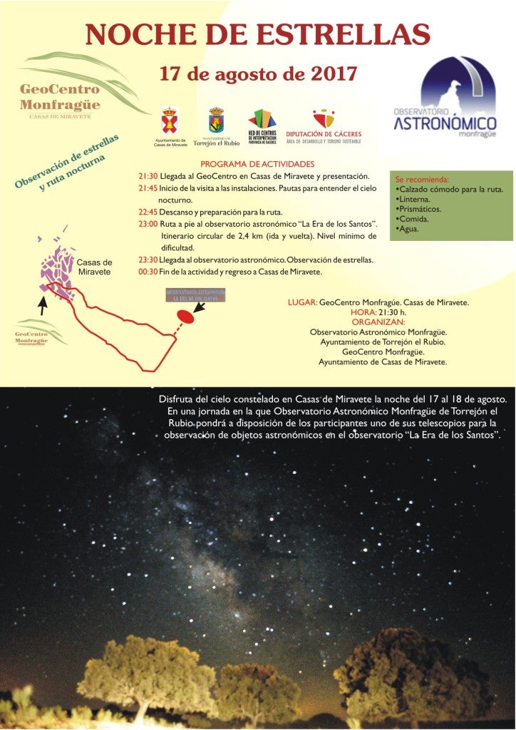 El observatorio astronómico La Era de los Santos, de Casas de Miravete, será escenario en la noche del jueves 17 de una jornada de observación de estrellas organizada por el Observatorio Astronómico Monfragüe, de Torrejón el Rubio, y GeoCentro Monfragüe, de la misma población, además de una ruta senderista de 2,4 kilómetros.