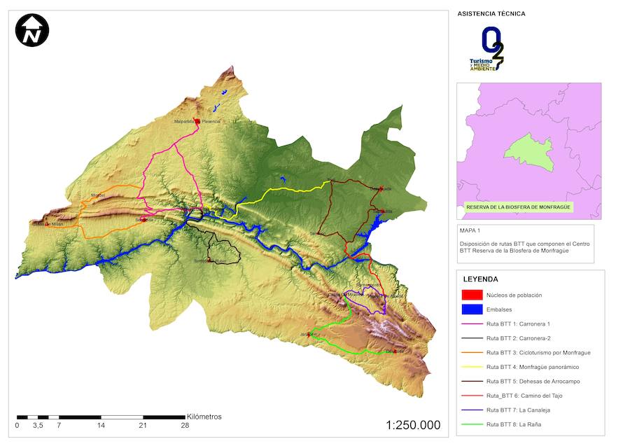 Carronera-1, Carronera-2, Cicloturismo por Monfragüe, Monfragüe panorámico, Dehesas de Arrocampo, Camino del Tajo, La Canaleja y La Raña son los nombres de las ocho rutas para bicicleta de montaña o todo terreno que ha diseñado la Diputación de Cáceres, conectando los 14 municipios de la Reserva de la Biosfera del parque nacional.