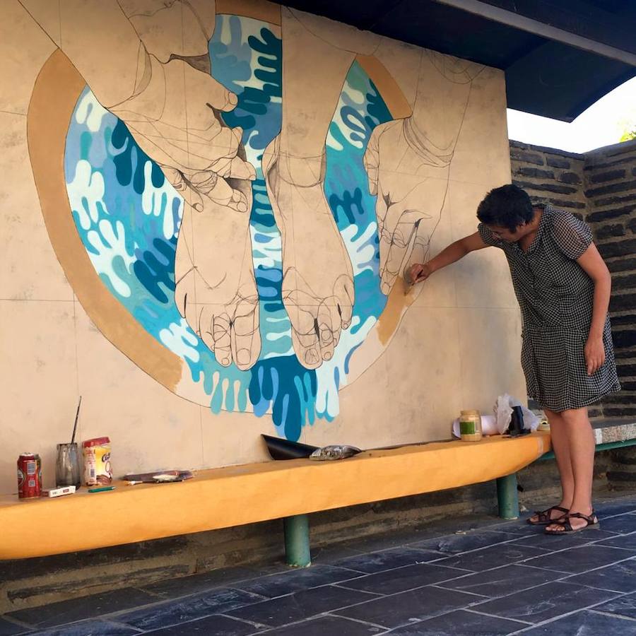 Nieta de bohonalos, explica la inspiración de sus murales callejeros: tradición, legado, herencia... Uno de ellos, que es itinerante, muestra unas manos cosiendo. «Cuando se teje se crean historias. Es un momento de relación entre las vecinas, que representan la tribu, el tejido social perdido en las ciudades», indican los autores, que incluyen una parte social en sus trabajos.