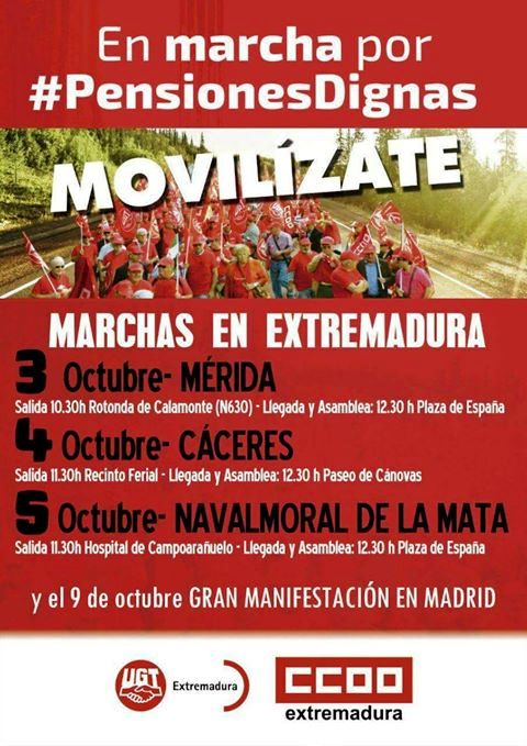 La Agrupación Socialista Morala expresa su total apoyo a las organizaciones sindicales UGT y CC.OO en su lucha por mantener y garantizar el Sistema Público de Pensiones; así mismo, manifestamos nuestra intención de acompañar a la marcha que, por esta causa, discurrirá por Navalmoral el jueves, 5 de octubre.