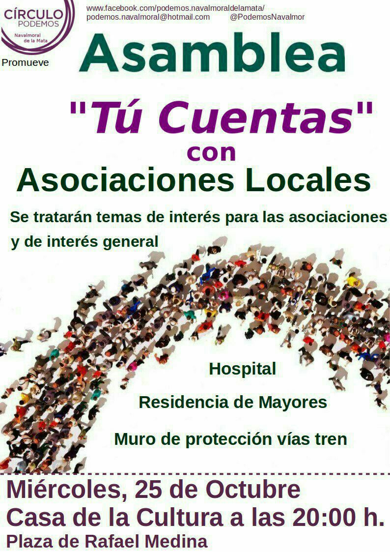 El Círculo Podemos Navalmoral organiza, desde la ruta presupuestaria 'Tu Cuentas', una asamblea con asociaciones locales: vecinales, culturales, educativas, de salud, humanitarias, de mujeres, AMPAS y otras.