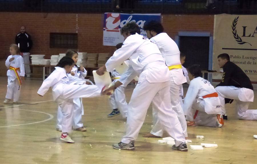Más de un centenar de taekwondistas de distintas edades, a partir de los 4 o 5 años, participaron en la exhibición que la escuela de Gabriel Amado realizó en la tarde del miércoles en el pabellón polideportivo para despedir el año. Y además lo hizo con un motivo solidario, conseguir alimentos para entregar a Cáritas.