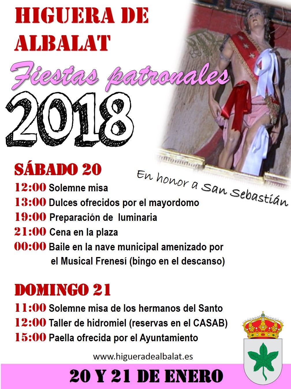 La pequeña población de Higuera de Albalat vivirá este fin de semana las fiestas patronales de San Sebastián. Los actos se iniciarán a las doce del mediodía del sábado con una misa, seguida de una degustación de dulces típicos ofrecidos por el Mayordomo.