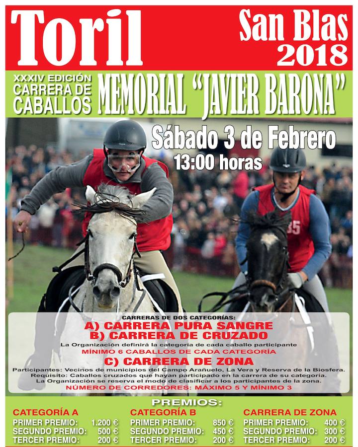 Pero sin duda el momento más esperado es la carrera de caballos Memorial Javier Barona, que este año llega a su trigésimo cuarta edición y que tendrá lugar desde la una de la tarde. Habrá dos categorías en liza, pura sangre y cruzado. En pura sangre los tres primeros clasificados recibirán 1.200, 500 y 200 euros de premio respectivamente, mientras que en cruzado serán de 850, 450 y 200 euros.
