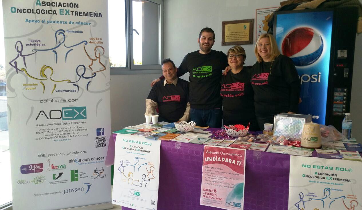 Miembros de la Asociación Oncológica Extremeña (AOEX) han abierto una mesa informativa en el hospital Campo Arañuelo con motivo del Día Mundial contra el Cáncer, que se conmemoró el domingo, para dar a conocer a pacientes y familiares todo lo referente a esa enfermedad.