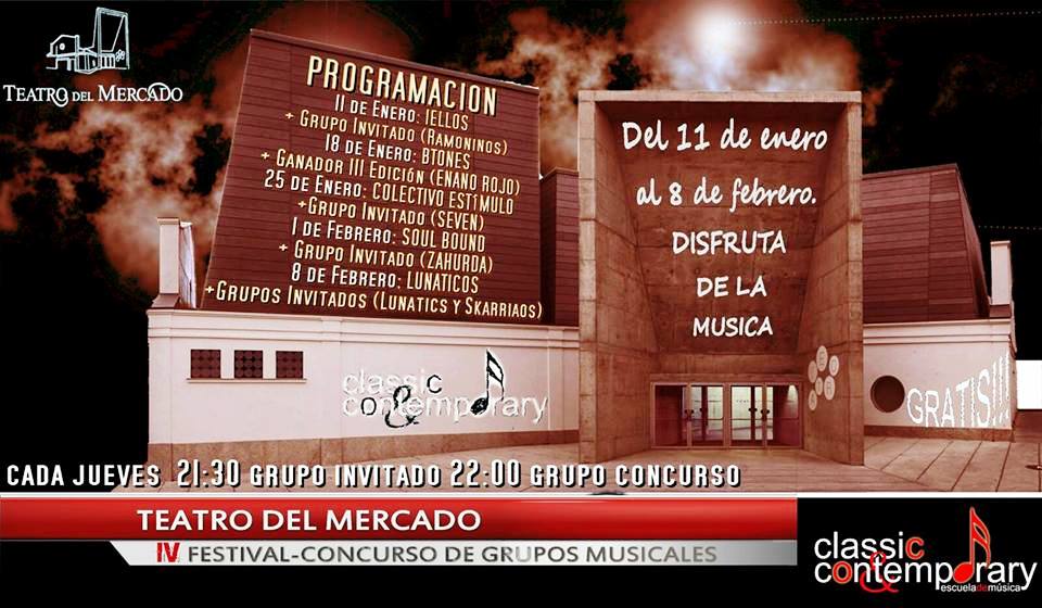 El blues, el soul y el rock de Soul Bound se 'enfrentará' a la fusión funky rumba de Colectivo Estímulo en la final del IV Festival-Concurso de Grupos Municipales que se viene celebrando desde primeros de año en el Teatro del Mercado. Se trata de una iniciativa de la academia classic@contemporary, con la colaboración del Ayuntamiento. Será a partir de las diez de la noche del viernes, con entrada libre.