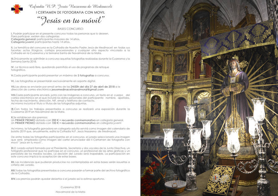 'Jesús en tu móvil' es el título que ha puesto la cofradía de Jesús Nazareno de Medinaceli al concurso de fotografía con móvil que ... ha convocado con motivo de la cercana Semana Santa. En las bases, que se hicieron públicas el martes, se establecen dos categorías, juvenil, hasta 14 años, y general a partir de esa edad, con un premio en el primer caso de 100 euros y en el segundo de 200, además de un recuerdo conmemorativo.