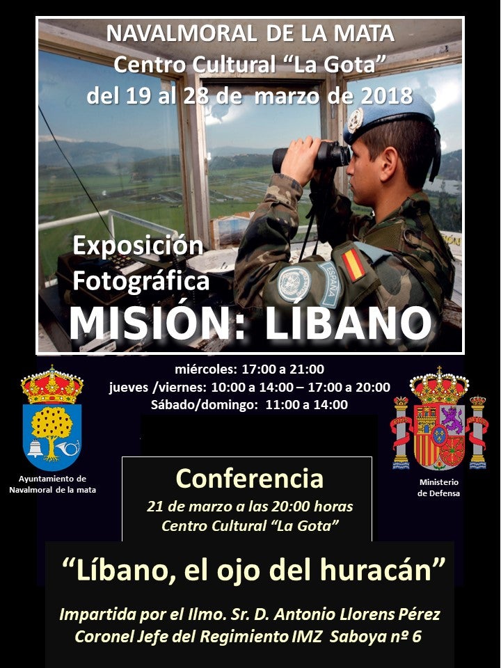 La muestra fotográfica se completará con una conferencia el miércoles, 'Líbano, el ojo del huracán', a cargo del coronel jefe del regimiento IMZ Saboya nº6, Antonio Llorens Pérez.