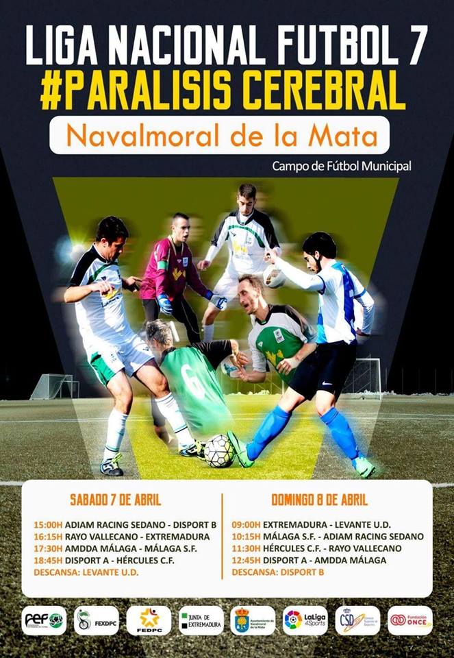 Navalmoral acogerá los días 7 y 8 de abril dos jornadas de la Liga Nacional Futbol 7 de Parálisis Cerebral, que organiza la Federación Española de Deportes de Personas con Parálisis Cerebral y Daño Cerebral Adquirido, con la colaboración de distintas instituciones, como la Federación Extremeña de Fútbol, la Junta de Extremadura, LaLiga, el Consejo Superior de Deportes, la Fundación ONCE y a nivel local el Ayuntamiento y el Moralo CP.