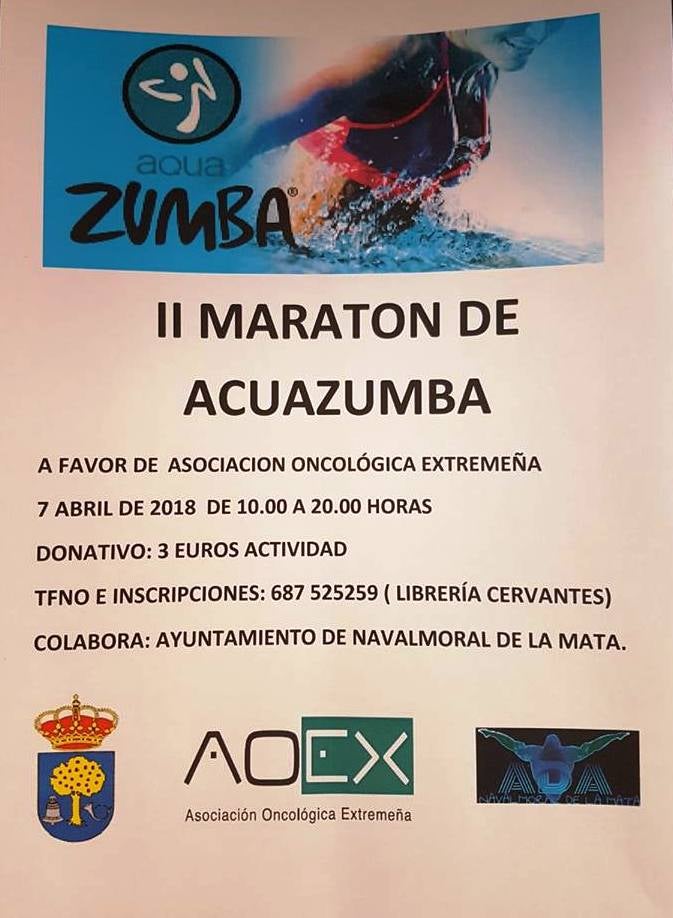 La piscina climatizada acogerá el sábado el II Maratón de Aquazumba a favor de la Asociación Oncológica Extremeña (AOEX), organizado por la Asociación Deportiva Acuática con la colaboración del Ayuntamiento. Se desarrollará entre las 10.00 h. y las 20.00 h. La inscripción para tomar parte debe hacerse en la librería Cervantes abonando un donativo de 3 euros. Más información en el teléfono 687 52 52 59.
