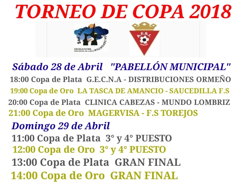 En la Copa de Oro, los choques del sábado serán La Tasca de Amancio-Saucedilla, a las siete, y Magervisa-FS Torejos, a las nueve. La consolación de los perdedores será a las doce del domingo y la final entre los ganadores a las dos.