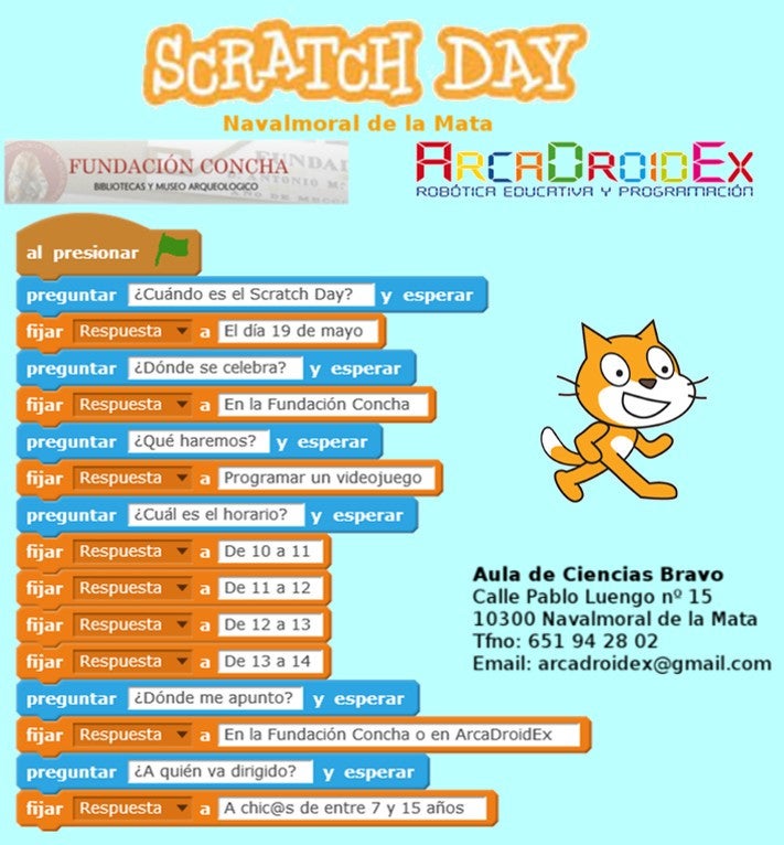 La asociación ArcaDroidEx, de robótica educativa y programación, celebrará este sábado en la Fundación Concha el 'Scratch Day'. Se trata de un lenguaje basado en bloques que se utiliza para iniciarse en el mundo de la programación, sobre todo para videojuegos, robots, historias animadas o presentaciones.