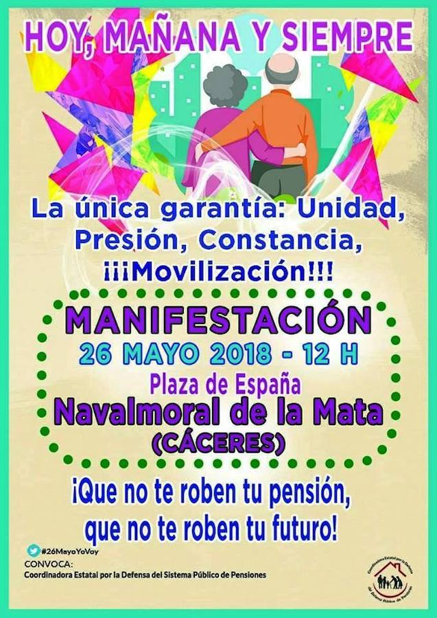 Pensionistas y futuros pensionistas están convocados a una nueva manifestación en la mañana del sábado 26 convocada por la Coordinadora Estatal por la Defensa del Sistema Público de Pensiones. 'Hoy, mañana y siempre. La única garantía: unidad, presión, constancia, movilización. ¡Que no te roben tu pensión, que no te roben tu futuro' es su lema. Saldrá a las 12.00 h. de la plaza de España.