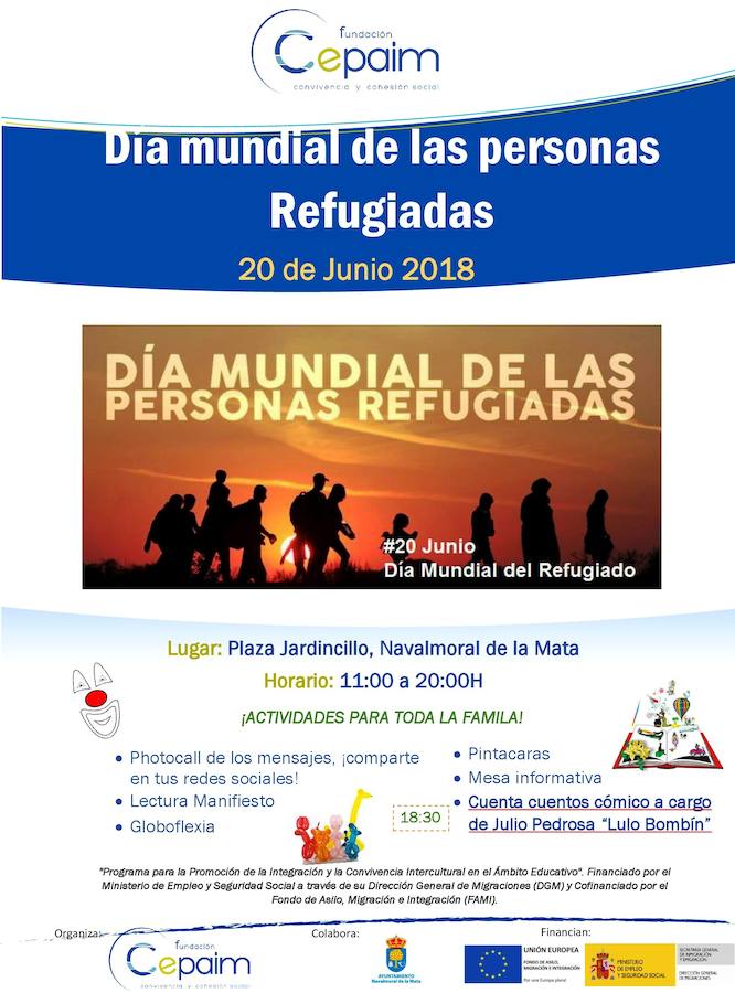 La Fundación Cepaim se sumará el miércoles 20 a la celebración del Día Mundial de las Personas Refugiadas con la realización de distintas actividades en el Jardincillo, para toda la familia, que se prolongarán desde las once de la mañana a las ocho de la tarde. Se anuncian la lectura de un manifiesto, una mesa informativa, un photocall, talleres de globoflexia y pintacaras y un cuenta cuentos cómico, a las seis y media, a cargo de Julio Pedrosa, 'Lulo Bombín'.