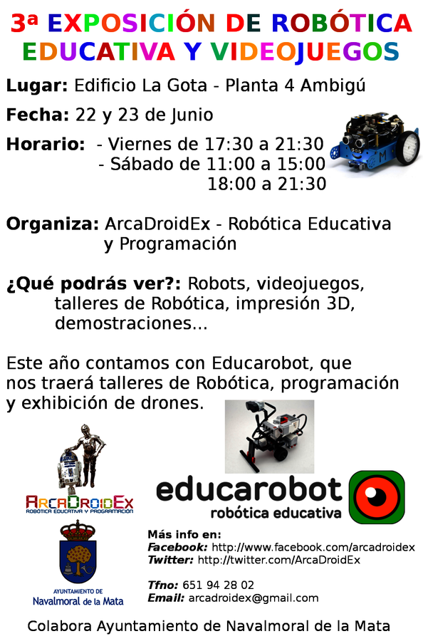 En el mismo edificio de La Gota, pero en la cuarta planta, la asociación ArcaDroidEx organiza este fin de semana su tradicional exposición de robótica educativa, programación y video juegos. En su tercera edición ofrece la realización de talleres gratuitos o una exhibición de drones de la mano de Educarobot.