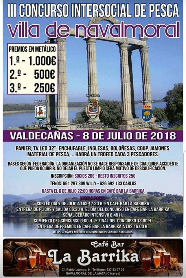 Mil euros de premio en metálico recibirá el ganador del III Concurso Intersocial de Pesca 'Villa de Navalmoral', que se celebrará el domingo en el pantano de Valdecañas organizado por la Unión de Pescadores Moralos, con la colaboración del Ayuntamiento.