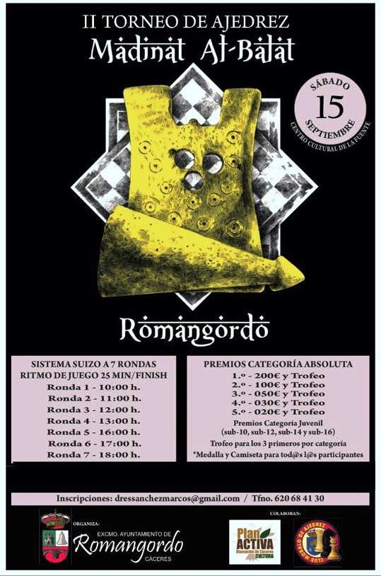 Romangordo acogerá el próximo día 15 el II Torneo de Ajedrez Madinat Al-Balat, que surgió hace un año como consecuencia de las dos piezas de época árabe, una torre y un peón, encontradas en las excavaciones que se vienen haciendo en el yacimiento arqueológico del mismo nombre. Está organizado por el Ayuntamiento, con la colaboración del Club Moralo de Ajedrez.
