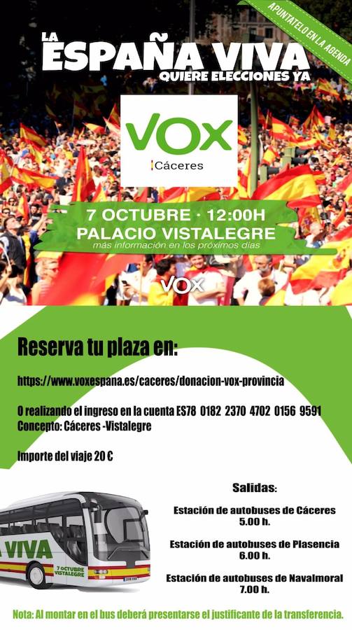 Lo que sí se mantiene es la convocatoria que han lanzado a sus simpatizantes para que reserven plazas en los autobuses que se quieren fletar en la provincia para asistir a la concentración nacional que celebrarán el 7 de octubre en el Palacio de Vistalegre, en Madrid.
