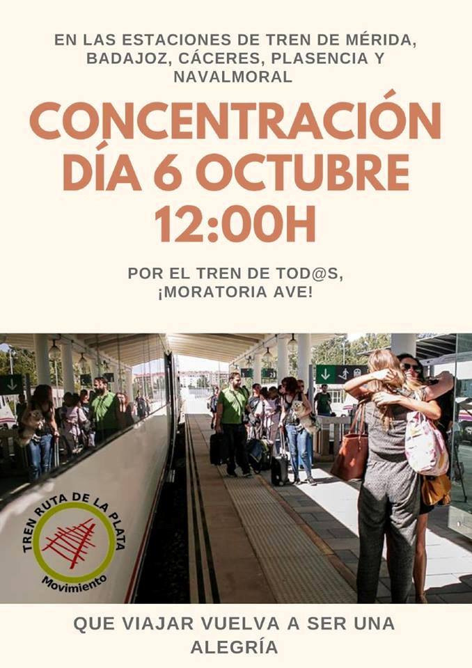 El Movimiento por el Tren Ruta de la Plata ha convocado concentraciones en las estaciones de Navalmoral, Plasencia, Cáceres, Mérida y Badajoz el sábado, 6 de octubre, en defensa del tren convencional y por una moratoria para las obras de construcción de la línea del AVE.