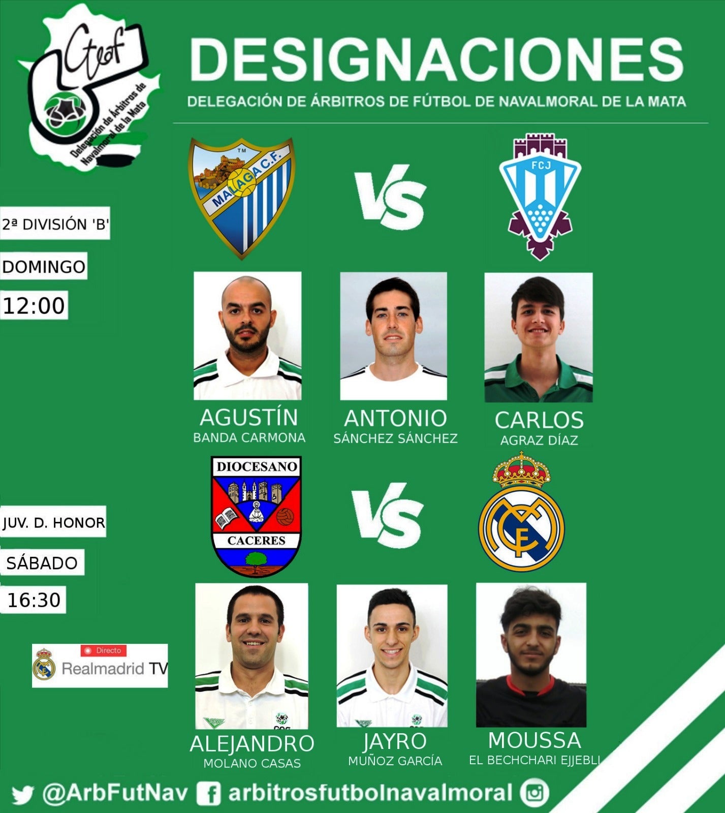 Fin de semana importante para la Delegación de Árbitros de Fútbol de Navalmoral, ya que dos de sus integrantes, Jayro Muñoz y Carlos Agraz, debutarán en una nueva categoría.