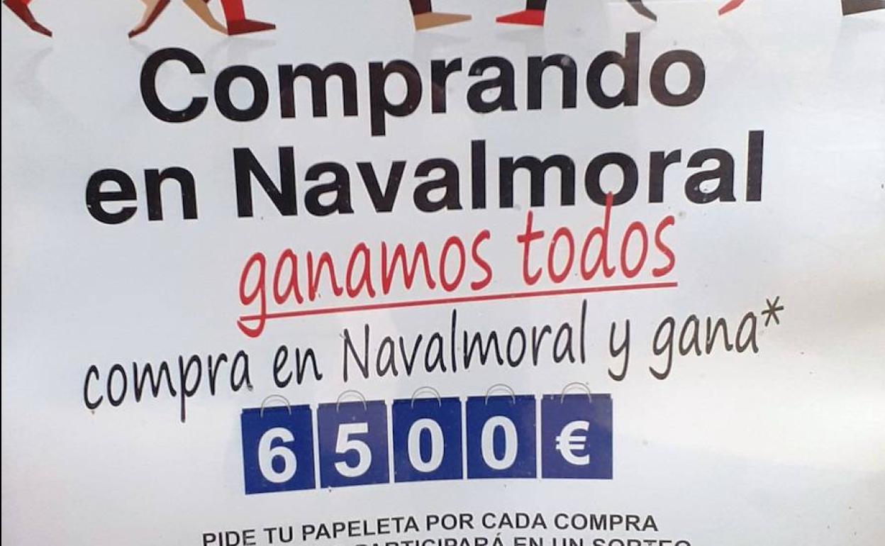 'Comprando en Navalmoral ganamos todos. Compra en Navalmoral y gana 6.500 euros'. Ese es el lema de una nueva campaña de dinamización comercial que lucen algunos establecimientos locales, promovida por la concejalía de Comercio, Empleo y Emprendimiento con financiación de la consejería de Economía, Ciencia y Agenda Digital. En el cartel anunciador se dice que el cliente pida una papeleta por cada compra que haga y que el número que reciba participará en un sorteo en combinación con la Lotería del Niño.